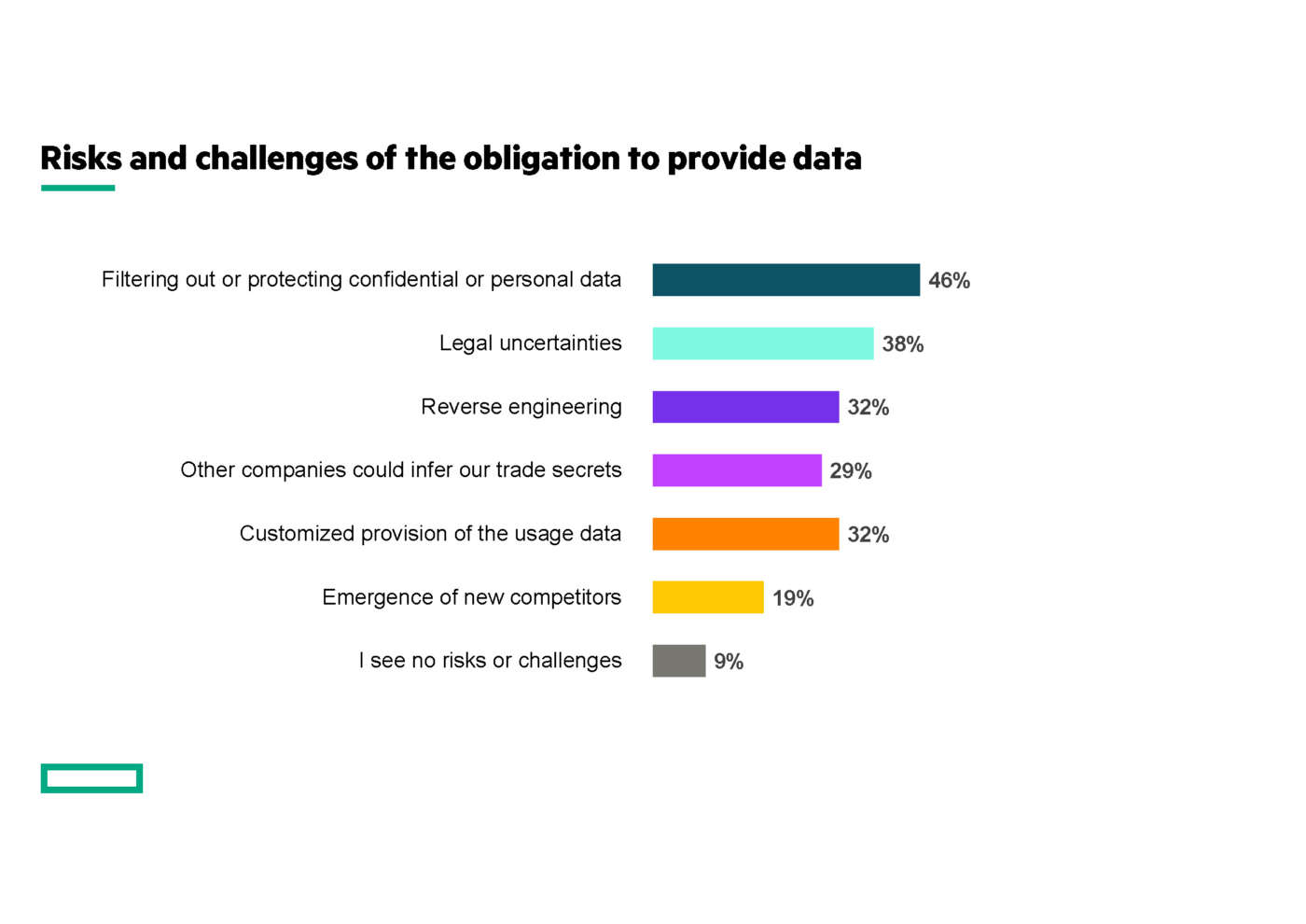 Non sorprende che la sfida maggiore posta dal Data Act sia quella di filtrare o proteggere i dati riservati e personali durante la raccolta degli stessi (46%), cui seguono le difficoltà di natura legislativa (38%). Inoltre, mette ancora in evidenza HPE, gli intervistati temono che la divulgazione dei dati di utilizzo dei loro prodotti possa consentire il reverse engineering (32%).