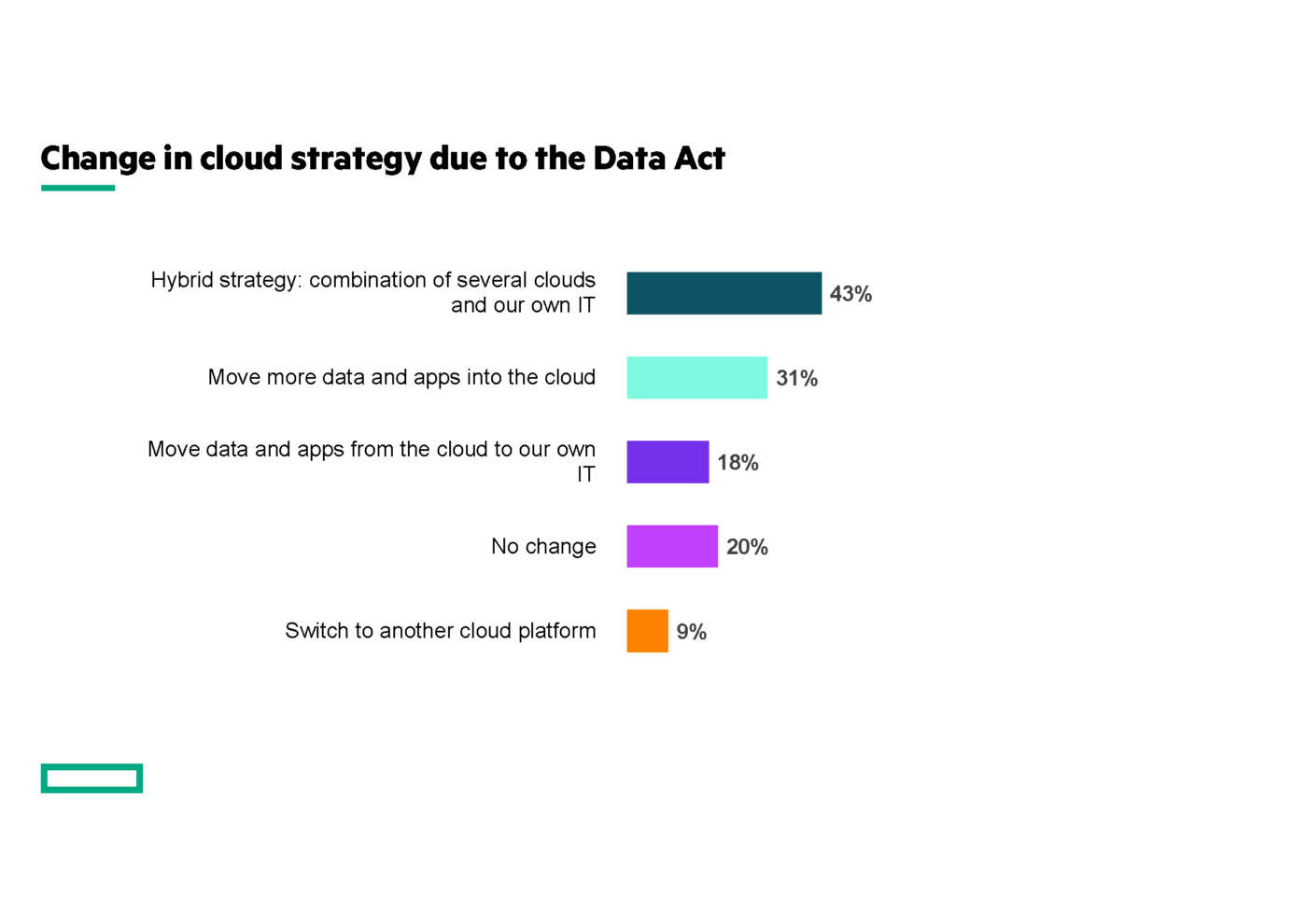 Secondo l’indagine di HPE, questa parte del Data Act porterà a una maggiore predisposizione delle aziende a cambiare e a diversificare i propri ambienti cloud. Solo il 20% degli intervistati ritiene che il Data Act non sarà un motivo sufficientemente valido per cambiare la propria strategia per il cloud. La maggior parte dei dirigenti (43%) afferma che la propria organizzazione si orienterà verso una strategia di cloud ibrido, combinando più piattaforme cloud con i propri sistemi IT. Inoltre, i manager hanno dichiarato che sposteranno più dati e applicazioni nel cloud (31%) da un lato e, dall’altro, porteranno i dati stessi e le applicazioni all’interno del proprio ecosistema IT (18%).