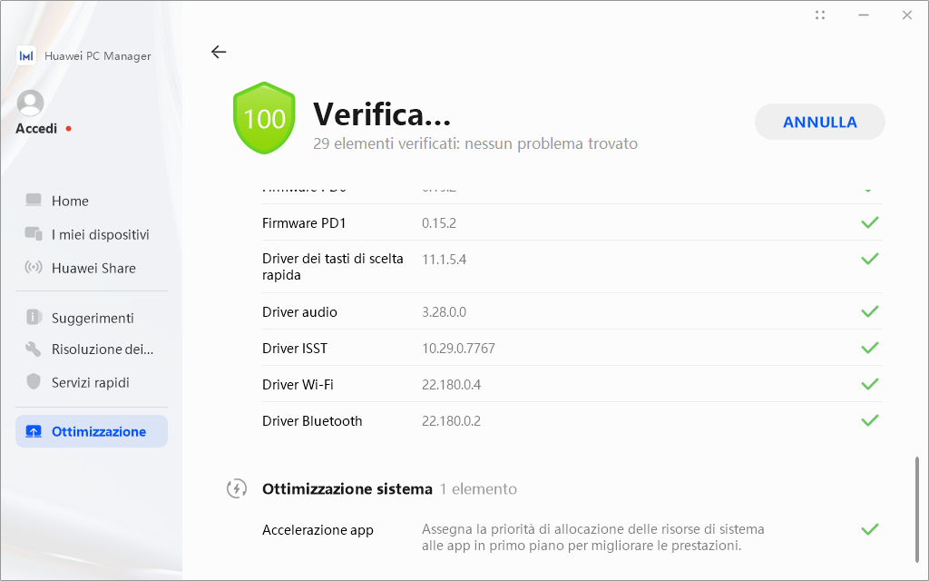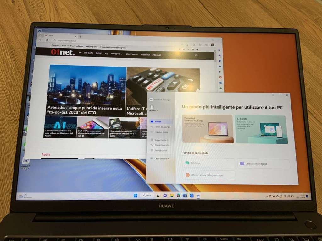 Molte delle funzionalità di telecamera, microfoni e in genere specifiche del computer sono fornite dal software Huawei PC Manager che viene installato insieme a Windows 11 Home, il sistema operativo incluso. Grazie a questo software tutti i driver vengono mantenuti aggiornati e vengono abilitate le funzionalità tipiche dell’ecosistema Huawei, in particolare quelle definite Super Device dove il computer può collegarsi, grazie a popup automatici e nessuna configurazione specifica, a telefoni, monitor esterni, cuffie ed altri accessori della stessa azienda.
