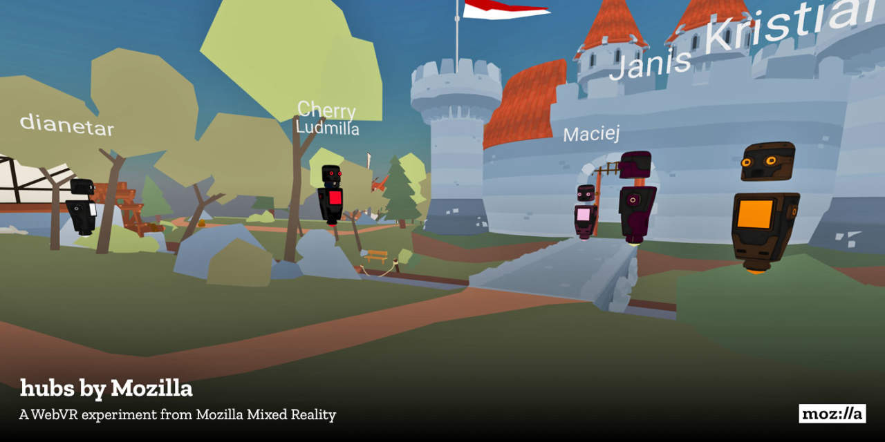 Mozilla Hubs fornisce un ambiente di base in cui i partecipanti, sotto forma di avatar di robot, possono scambiare e persino interagire in modo semplice (battendo le mani, giocando con un’anatra di plastica…).