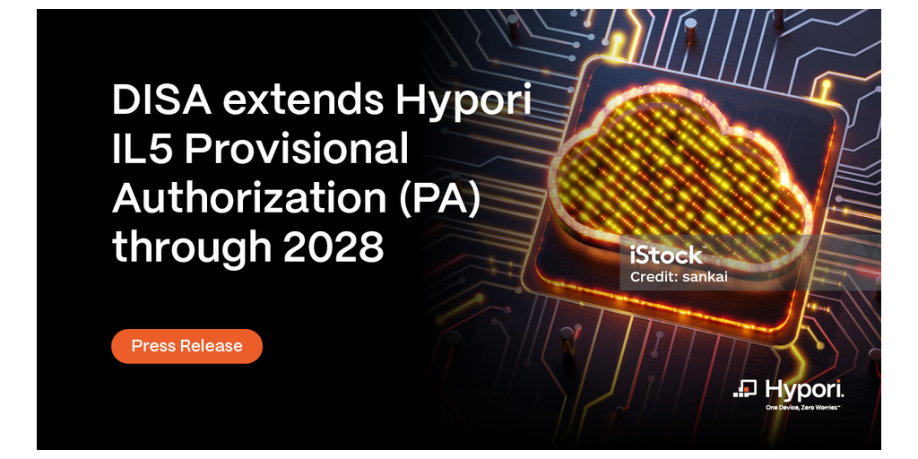 RESTON, Va.--(BUSINESS WIRE)--Hypori, the leading cybersecurity SaaS provider enabling zero trust bring-your-own-device (BYOD) capability via any mobile device, is proud to announce that the Defense Information Systems Agency (DISA) has granted Hypori an IL5 Provisional Authorization (PA) extension through 2028. Following the new assessment, Hypori’s SaaS-based IL5 environment is now categorized at the High-Baseline (IL5 High) according to the DISA Authorizing Official (AO), up from its previous Moderate-Baseline (IL5 Moderate).