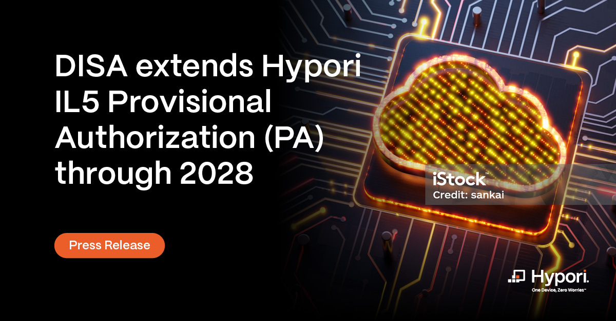 RESTON, Va.--(BUSINESS WIRE)--Hypori, the leading cybersecurity SaaS provider enabling zero trust bring-your-own-device (BYOD) capability via any mobile device, is proud to announce that the Defense Information Systems Agency (DISA) has granted Hypori an IL5 Provisional Authorization (PA) extension through 2028. Following the new assessment, Hypori’s SaaS-based IL5 environment is now categorized at the High-Baseline (IL5 High) according to the DISA Authorizing Official (AO), up from its previous Moderate-Baseline (IL5 Moderate).