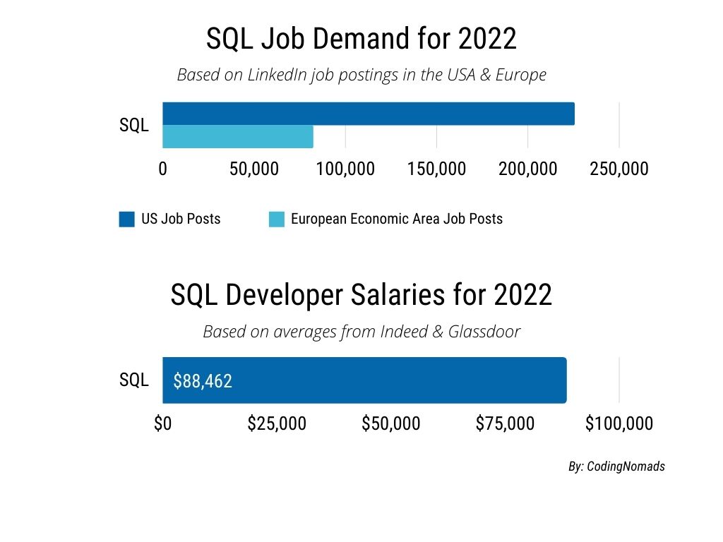 Tuttavia, sottolinea ancora CodingNomads, SQL merita una menzione d’onore perché presenta più offerte di lavoro di tutti gli altri linguaggi della lista sia negli Stati Uniti che in Europa.