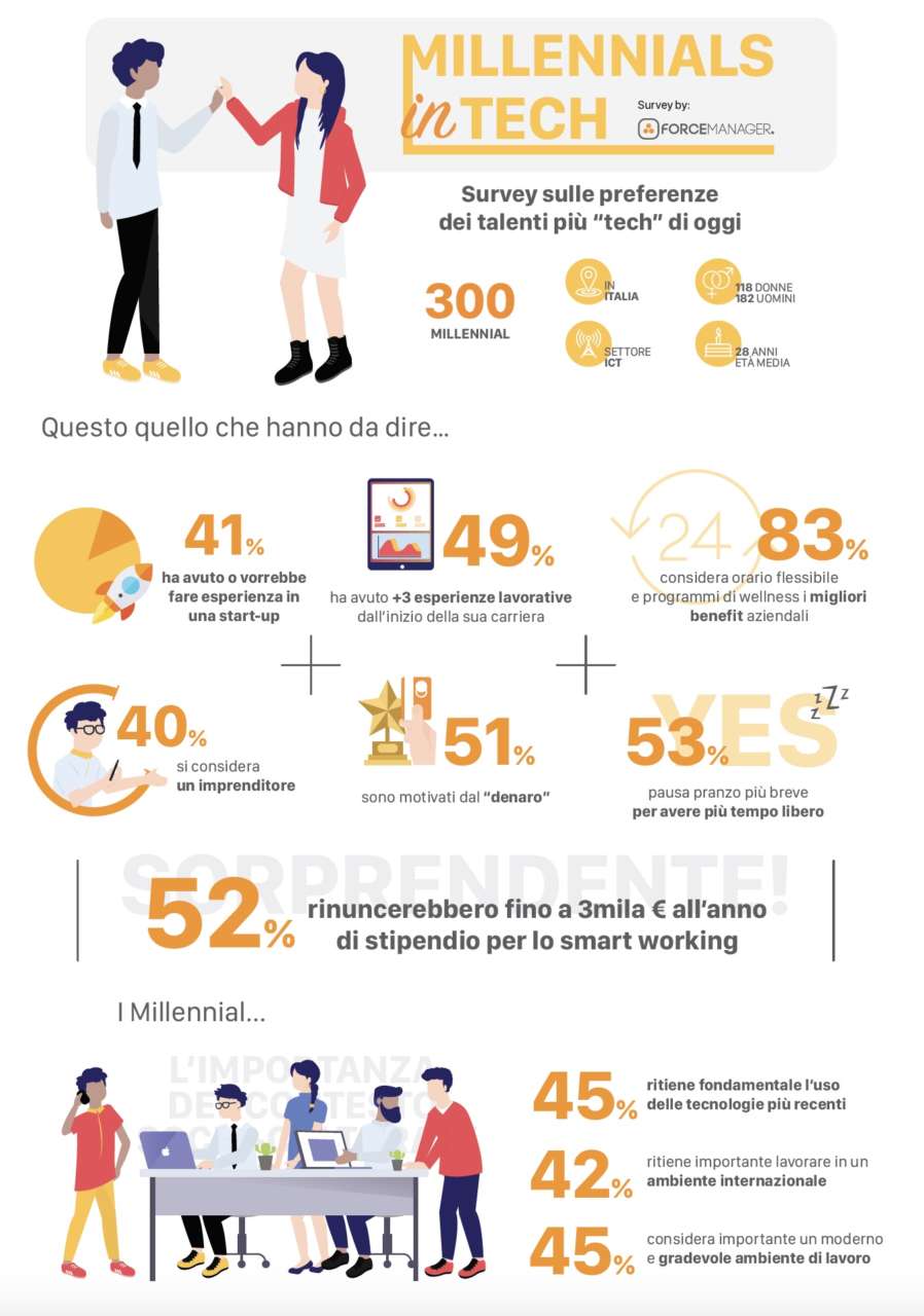 Pronto a lavorare per una startup, deciso a sfruttare lo smart working, desideroso di accedere alla possibilità di vivere da nomade digitale e a utilizzare app per l’incremento della produttività: questo il profilo di sintesi del millennial fotografato dall’indagine condotta da ForceManager.