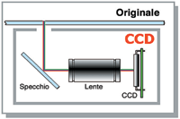 A essa sono abbinate le lenti, uno specchio e una o più righe di sensori CCD, dotati di filtri dei tre colori principali RGB, che traducono in impulsi elettrici le variazioni di luminosità.