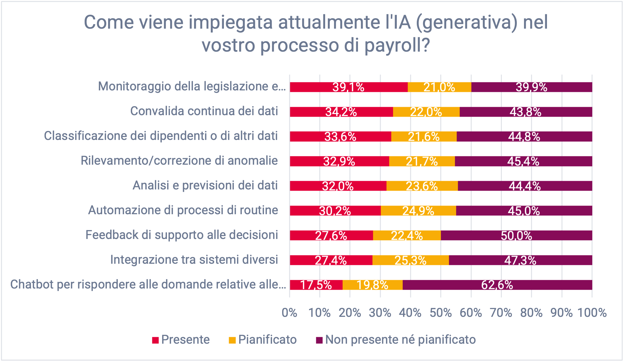 Ma come viene o verrà impiegata principalmente l’IA all’interno del payroll e dei processi HR? Nel caso italiano, classificazione degli impiegati (35%), data analytics, predictions (30%) rilievo e correzione delle anomalie (32%) sono gli utilizzi maggiormente apprezzati. Mentre in Europa il supporto legislativo è l’applicazione ad oggi dominante, è invece pianificato dal 28% delle aziende italiane.