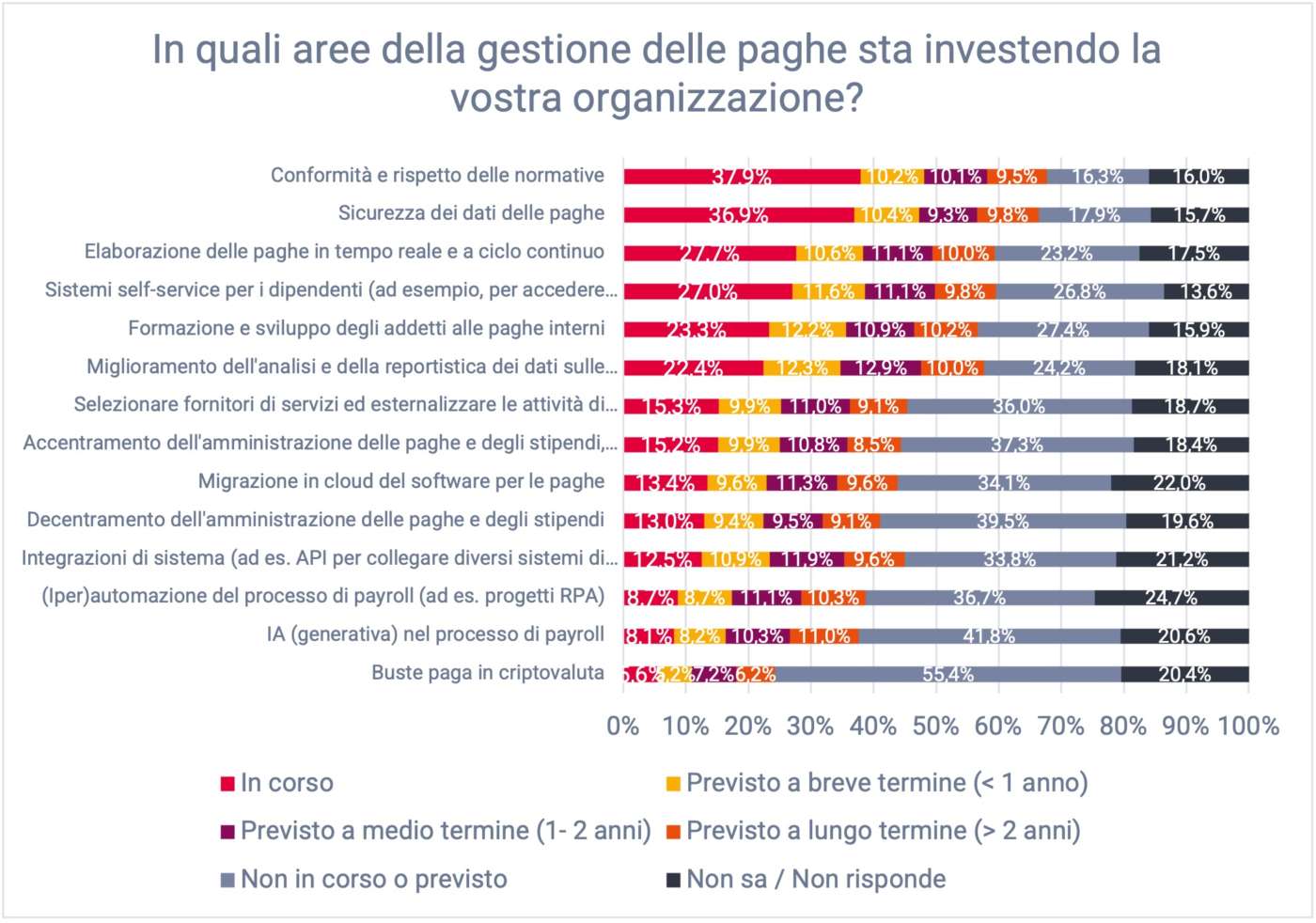 Di fatto, un’azienda europea su tre sta investendo per implementare l’intelligenza artificiale sul posto di lavoro e il 37% si sta impegnando economicamente per portare la generative AI nella processazione delle buste paga, oggi o nel futuro prevedibile (grafico 3).