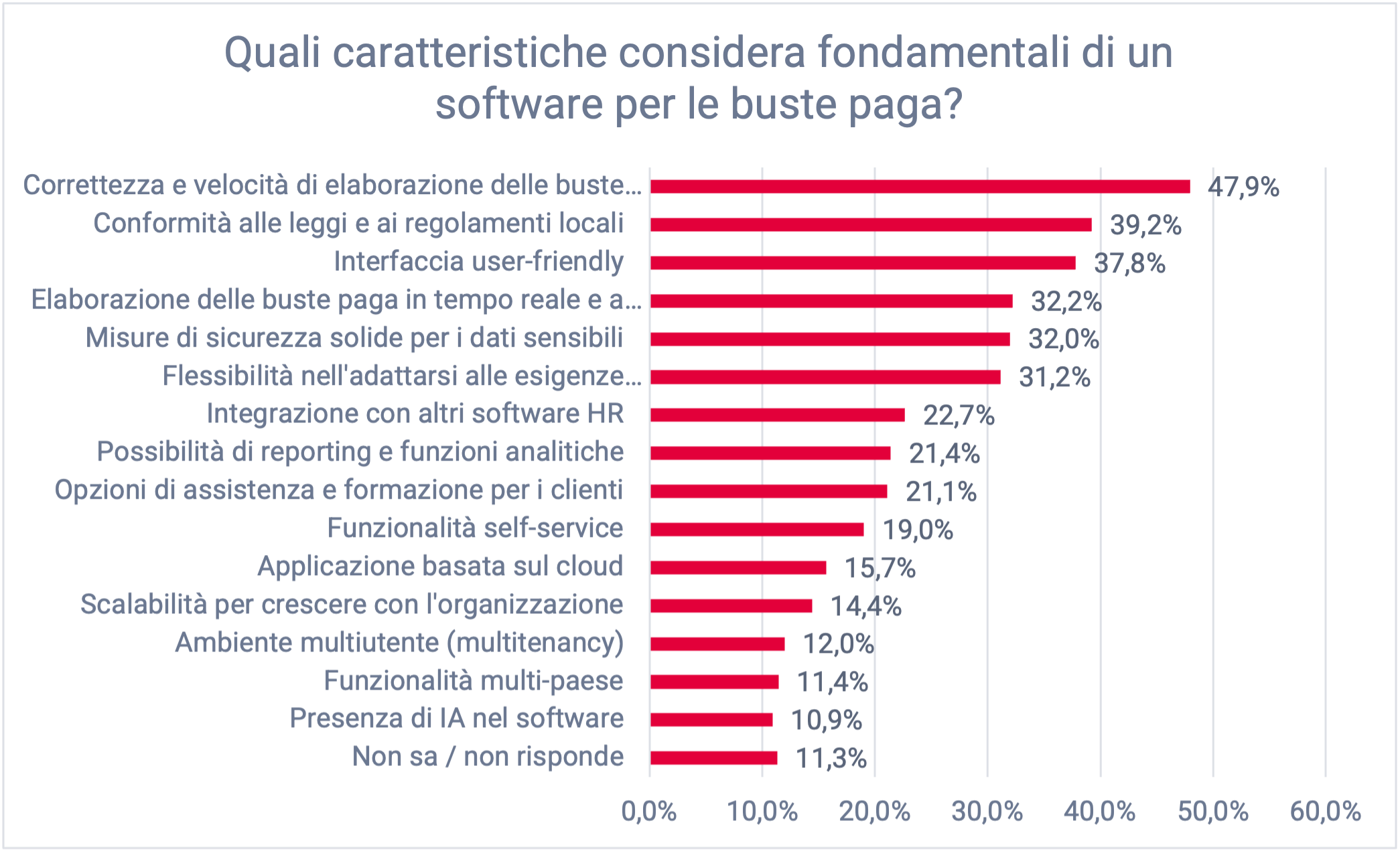 Ciononostante, se l’esigenza sembra ancora contenuta, il potenziale è indubbiamente riconosciuto. Interrogati su quali funzioni, capacità e caratteristiche siano essenziali in un software payroll, l’intelligenza artificiale è risultata in fondo alla classifica, ma il 22% delle organizzazioni indica di utilizzare già la tecnologia AI nel proprio processo di payroll.