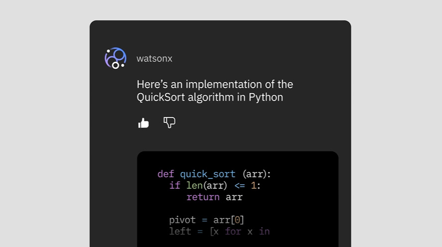 Basata sui modelli di codice di IBM Granite, l’ultima versione di IBM watsonx Code Assistant contribuisce ad aumentare la produttività degli sviluppatori grazie all’assistenza contestuale resa disponibile direttamente nell’ambiente di sviluppo integrato (IDE). Offre assistenza al codice in tempo reale grazie all’interfaccia di chat integrata e al completamento intelligente del codice nell’editor di codice. Gli sviluppatori possono beneficiare di un feedback istantaneo, del rilevamento degli errori e di miglioramenti, con il supporto di completamenti a linea singola, a più linee e di commenti al codice, rendendolo essenziale per l’ottimizzazione dei flussi di lavoro di programmazione.