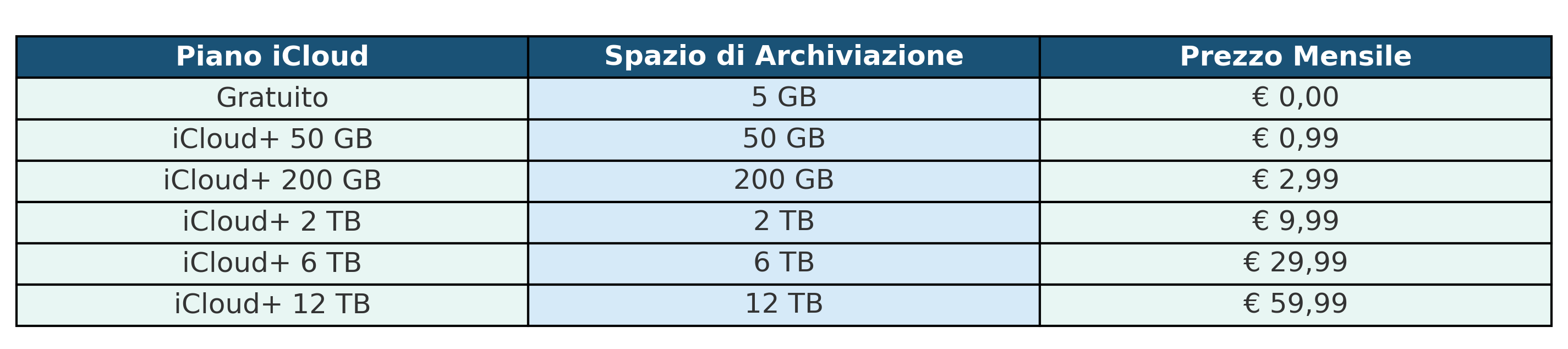 Di seguito, una tabella che riassume tutti i piani iCloud e iCloud+: invitiamo tuttavia a consultare la pagina ufficiale di Apple per informazioni aggiornate sui prezzi, le caratteristiche e le condizioni.