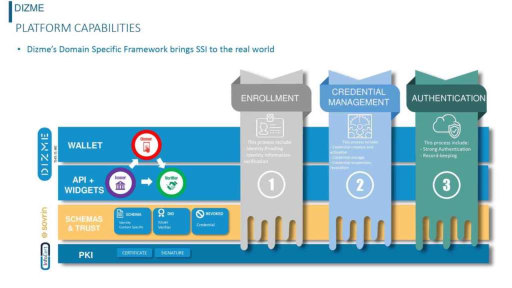 Dizme, di fatto, è il Domain Specific Network basato sul framework Sovrin, fondazione non profit con sede negli Stati Uniti nata per la diffusione della visione self-sovereign di cui InfoCert è Founding Steward.