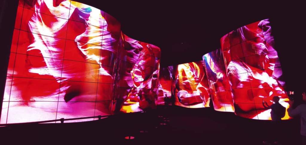 Il canyon curvo è lungo circa 27 metri ed è formato da 246 business display “Open Frame” LG Oled, disposti in una configurazione concava e convessa in grado di offrire un’esperienza di immersione visiva unica.