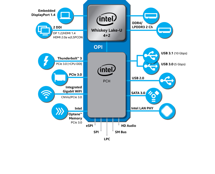 Si tratta della serie U (precedentemente nota con nome in codice Whiskey Lake) e della serie Y (precedentemente nota con nome in codice Amber Lake), ottimizzate per la connettività e destinate a notebook sottili e dispositivi 2 in 1 (una prima volta).