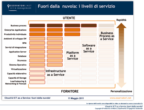 Nel SaaS, fra i servizi più usati troviamo la posta elettronica, la collaboration, la gestione delle risorse umane (applicazioni non core, insomma), mentre nei servizi IaaS e PaaS a farla da padrone sono la capacità elaborativa e di storage, le risorse virtuali configurate e il software infrastrutturale.