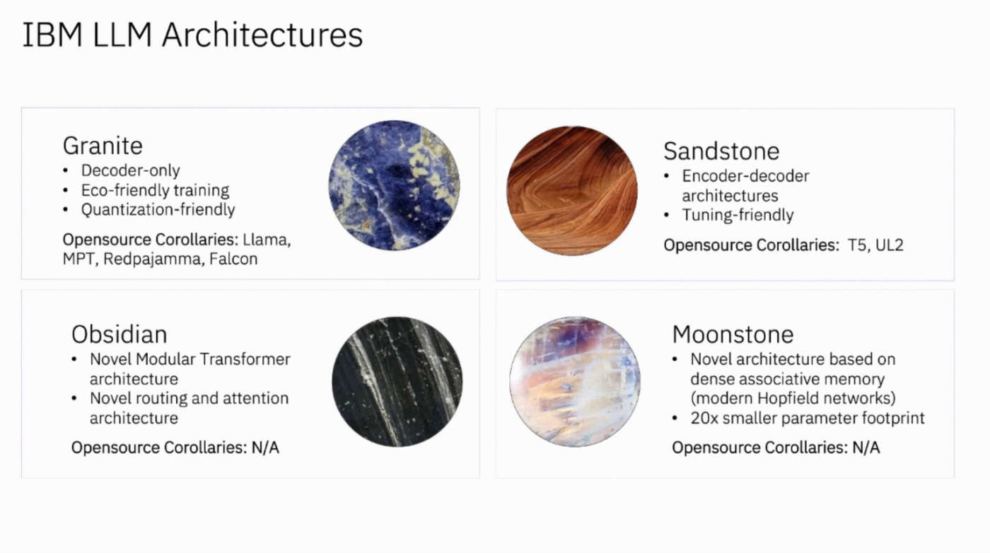 IBM sta addestrando un paio di architetture diverse di modelli linguistici di grandi dimensioni. Alcune di queste hanno corollari open source, mentre altre sono architetture nuove, sviluppate da IBM.