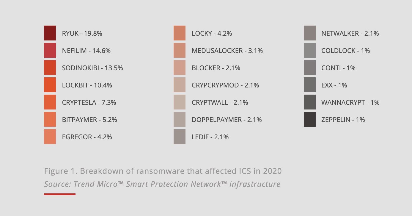 La ricerca Trend Micro svela che i ransomware più pericolosi per le industrie, e che insieme hanno raggiunto più della metà delle infezioni nel 2020, sono Ryuk (20% di attacchi), Nefilim (14,6%), Sodinokibi (13,5%) e LockBit (10,4%).