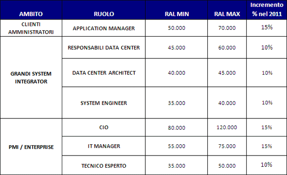 L’Osservatorio Michael Page punta ai System Engineer, con competenze software, hardware e infrastrutturali e una retribuzione media compresa tra 35 e 40 mila euro l’anno, ai Data Center Architect, con una retribuzione tra i 40 e i 45 mila euro annui, e ai Responsabili Data Center, con retribuzioni dai 45 ai 60 mila euro annui, per le strutture dei Grandi System Integrator.