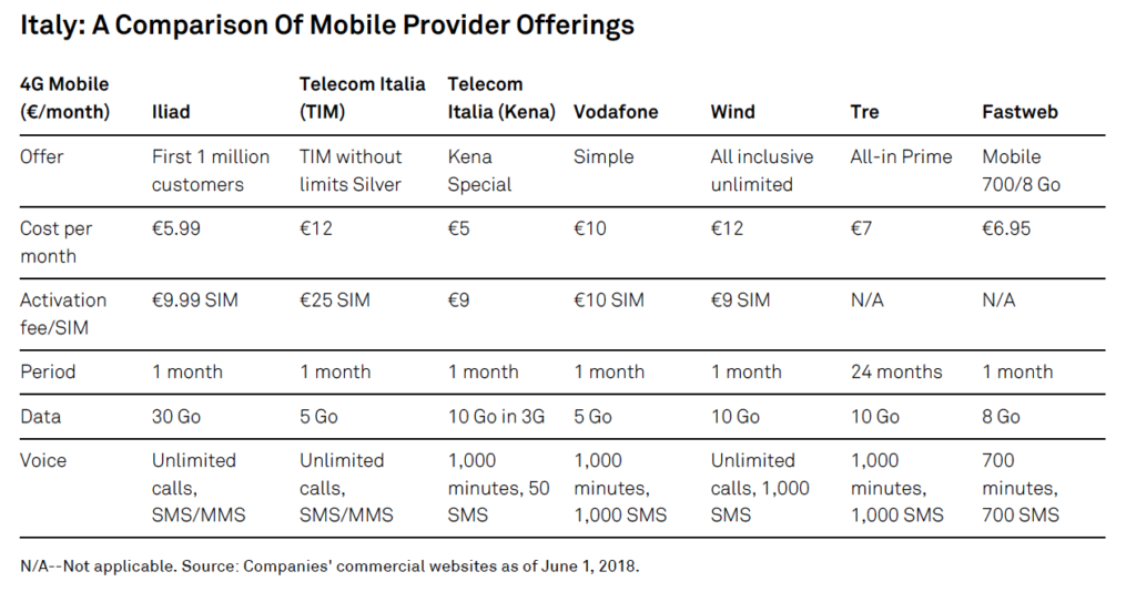 Standard & Poors Global Ratings considera l’offerta mobile italiana di Iliad come aggressiva, principalmente per via della grande quantità di dati piuttosto che per il prezzo: 5,99 euro al mese per 30 GB in 4G e conversazioni e sms illimitati.