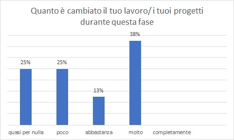 È però molto incoraggiante notare che per il 30% delle persone sostiene che non sia cambiato nulla o quasi. Molto bassa la  percentuale degli intervistati che hanno risposto che si  sono interrotti progetti su cui stava lavorando il 10%.