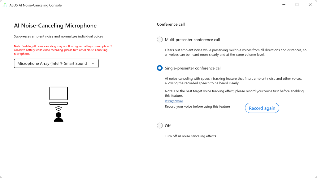 Abbiamo fatto una prova in uno spazio condiviso dove quattro persone parlavano a voce alta ognuna delle sue questioni: il primo esperimento è stato fatto senza filtro, ricevendo dall’altro capo tutto il rumore dell’ambiente, compreso di suoni delle sedie e degli oggetti mossi sulle scrivanie; in modalità Multi Presenter vengono rimossi con successo i rumori ma mantenute, ben intelligibili, le varie voci delle diverse persone. Infine, in modalità singola, come promesso il computer è in grado di filtrare tutto tranne la voce che ha imparato a riconoscere, anche parlandosi sopra: il risultato è decisamente impressionante.