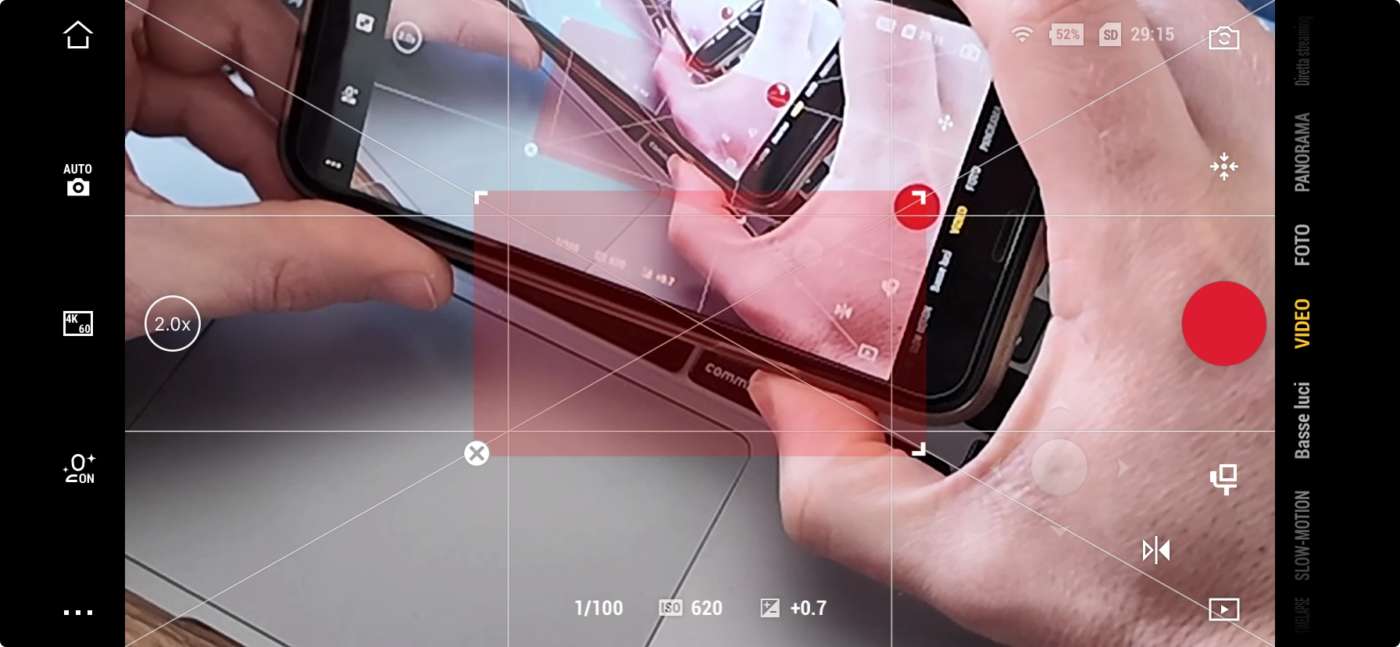 Il touchscreen è molto luminoso, ricco di controlli che possono essere attivati alla semplice pressione di un’icona o dei menu che compaiono facendo swipe praticamente da ogni lato. La posizione nella quale è disposto determina anche il tipo di video registrato: orizzontale per il classico formato 16:9 fino a 4K di risoluzione e 60 fotogrammi al secondo, o in verticale per le storie di Instagram e TikTok, con risoluzione tagliata a soli 3K, comunque più che sufficiente per l’esportazione sui social network.