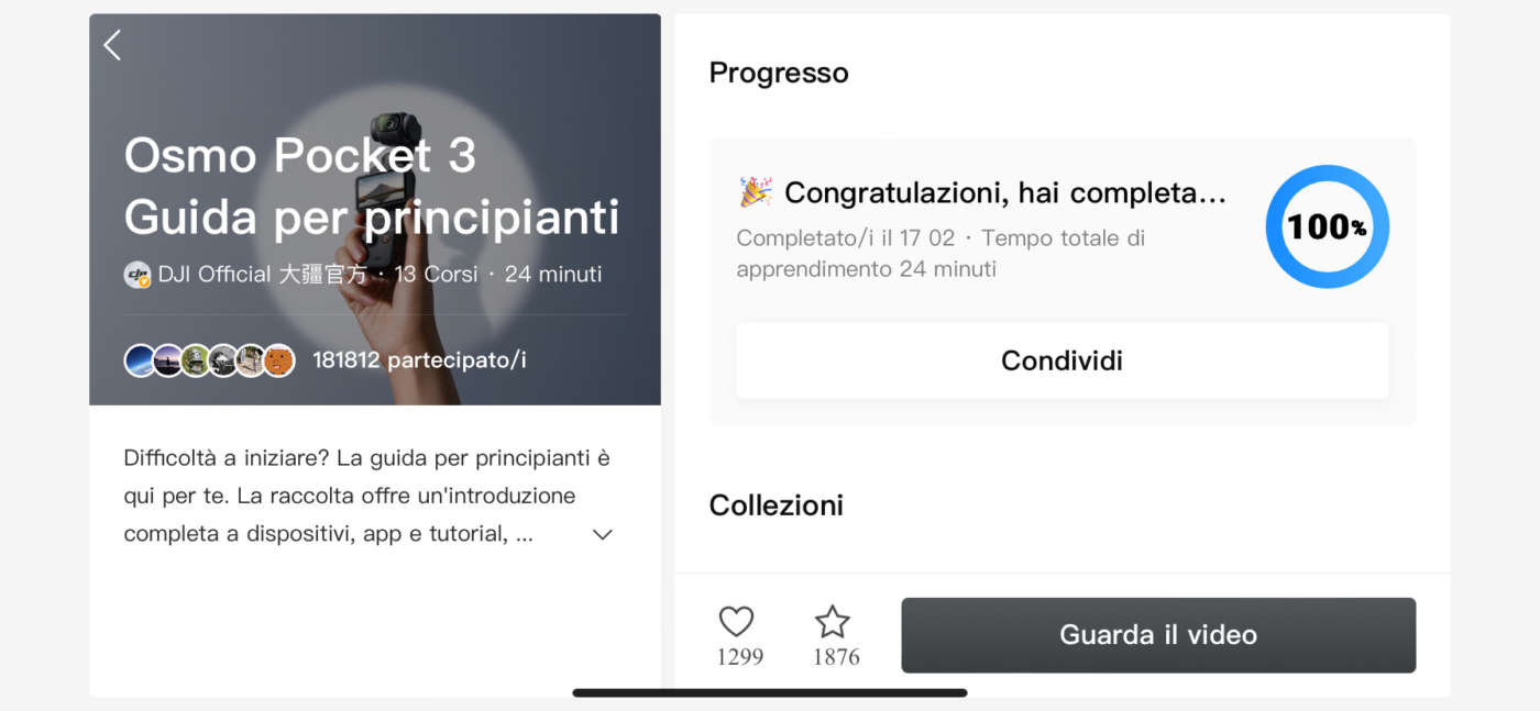 L’impugnatura è molto comoda, basta poco allenamento per imparare a tenere stabile l’immagine e gestire i movimenti di camera con il piccolo ma solido joystick. Imparare a usare il prodotto è fondamentale per poter ottenere video di alta qualità: per questo viene in aiuto DJI stessa che, nella sua app, fornisce un’abbondante serie di video, ognuno di pochi minuti, capaci di guidare l’operatore dai comandi base a diverse tecniche di ripresa e montaggio, insegnando come gestire le tipiche transizioni dinamiche, preparare un videolog o riprendere al meglio i propri animali domestici. Ogni esercizio aiuta nella scoperta delle numerose funzioni e stimola la creatività con idee per i propri contenuti.