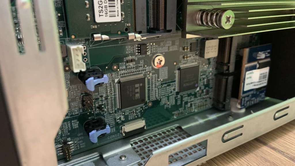Il case è costruito in solido metallo di colore nero trattato per resistere ai graffi e alle ditate; una volta sfilato il coperchio, tenuto fermo da poche viti di facile rimozione, possiamo apprezzare l’ordine con il quale sono stati posti i vari componenti, dalla scheda madre che prevede un suo spazio dedicato nel lato destro del prodotto, vistosamente coperta da un ampio dissipatore di calore, ai cavi che collegano i dischi e le alimentazioni, ben tirati e fascettati. Colpisce la quantità di spazio vuoto che troviamo nel case, atto a separare le componenti che più generano calore dalle grosse ventole: uno sguardo attento permette di comprendere come questo sia lasciato per permettere una migliore gestione delle temperature, riducendo il volume del rumore complessivo. Troviamo infatti ben quattro ventole: la più piccola è parte dell’alimentatore interno da 250 Watt, delle restanti una è dedicata a raffreddare la scheda madre, due per le unità disco, ovvero il pezzo che nei casi d’uso tipici di un file server dovrebbe scaldare maggiormente. Per le nostre prove abbiamo tenuto il NAS parecchi giorni sulla scrivania e il suono che più abbiamo udito è quello dello spin dei dischi fissi meccanici, con il ronzio del flusso d’aria sempre contenuto e, grazie anche al controllo dinamico della velocità, limitato solo ai momenti di maggiore utilizzo delle risorse.