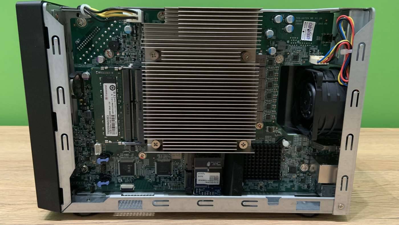 Il case è costruito in solido metallo di colore nero trattato per resistere ai graffi e alle ditate; una volta sfilato il coperchio, tenuto fermo da poche viti di facile rimozione, possiamo apprezzare l’ordine con il quale sono stati posti i vari componenti, dalla scheda madre che prevede un suo spazio dedicato nel lato destro del prodotto, vistosamente coperta da un ampio dissipatore di calore, ai cavi che collegano i dischi e le alimentazioni, ben tirati e fascettati. Colpisce la quantità di spazio vuoto che troviamo nel case, atto a separare le componenti che più generano calore dalle grosse ventole: uno sguardo attento permette di comprendere come questo sia lasciato per permettere una migliore gestione delle temperature, riducendo il volume del rumore complessivo. Troviamo infatti ben quattro ventole: la più piccola è parte dell’alimentatore interno da 250 Watt, delle restanti una è dedicata a raffreddare la scheda madre, due per le unità disco, ovvero il pezzo che nei casi d’uso tipici di un file server dovrebbe scaldare maggiormente. Per le nostre prove abbiamo tenuto il NAS parecchi giorni sulla scrivania e il suono che più abbiamo udito è quello dello spin dei dischi fissi meccanici, con il ronzio del flusso d’aria sempre contenuto e, grazie anche al controllo dinamico della velocità, limitato solo ai momenti di maggiore utilizzo delle risorse.