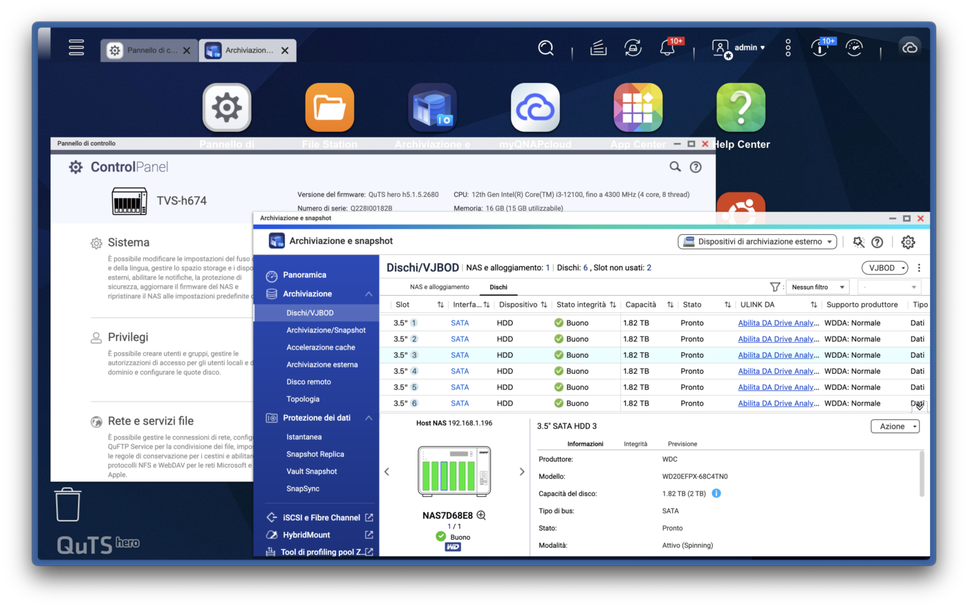 Il modello che abbiamo provato è QNAP TVS-h674-i3-16G, con processore Intel Core i3 a 4 core e 8 thread con 16 gigabyte di veloce memoria RAM DDR4 installata con un solo modulo di memoria, pronto per eventuali espansioni; esiste anche una versione più performante caratterizzata dal processore i5 con 6 core e 12 thread, e 32 gigabyte di RAM su due banchi. La serie si completa con un modello a quattro vani e uno più grande con ben otto spazi per i dischi.