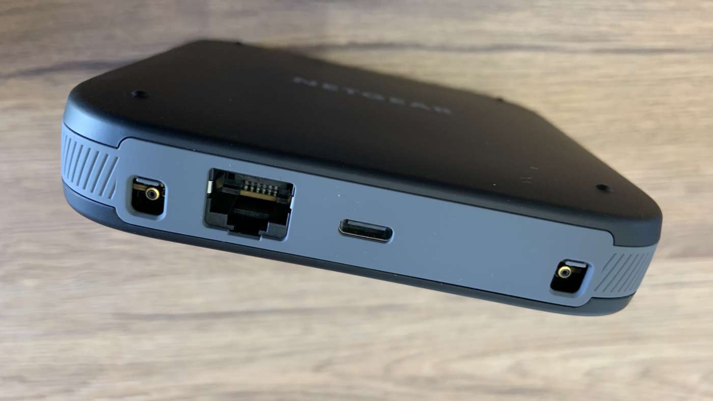 Il router è un piccolo oggetto a base quadrata, di circa 10 centimetri per lato e spesso 2 cm; presenta sulla superficie un display touch LCD da 2.8”, usato come strumento principale per il controllo e la gestione del prodotto. Sui bordi troviamo una porta USB-C, dedicata all’alimentazione, alla ricarica e anche al tethering dei dati, e nelle vicinanze una porta Ethernet capace di erogare dati fino a una velocità di 2.5 gigabit al secondo. Nascoste da piccoli coperchi di protezione troviamo inoltre i connettori di tipo RF TS9 per l’antenna cellulare esterna omnidirezionale, uno degli accessori disponibili per l’acquisto sullo store di Netgear a 49,99 euro: non l’abbiamo trovata necessaria nelle nostre prove, ma può essere utile per superare limiti quali l’abitacolo dell’auto o altri ambienti schermati, migliorando sensibilmente la qualità del segnale. Troviamo sul bordo superiore infine il bottone di controllo, unico pulsante fisico del router, usato per accendere e spegnere il dispositivo e per risvegliare il display touch, generalmente spento per ridurre i consumi di corrente.