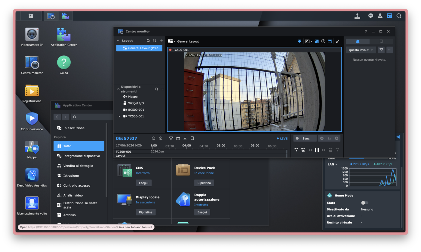 Oltre alle funzionalità AI, il software Surveillance Station si rivela avere tutte le funzioni che ci si aspettano da un sistema NVR / CCTV, con la capacità di mostrare in tempo reale diversi flussi video e registrarli in maniera sicura e cifrata. Comprende sistemi di sincronizzazione e backup con destinazione altri NAS o anche il servizio cloud C2 di Synology, venduto in abbonamento, ed è espandibile con diversi plugin, come quello per la gestione dei joystick hardware o uno dedicato allo streaming su piattaforme come YouTube. Dal pannello web si possono progettare dashboard per adattarsi al meglio nelle diverse situazioni di utilizzo; se si carica inoltre la mappa dell’edificio nel quale si è installato il sistema di sorveglianza, è possibile indicare visivamente dove sono puntate le diverse telecamere.