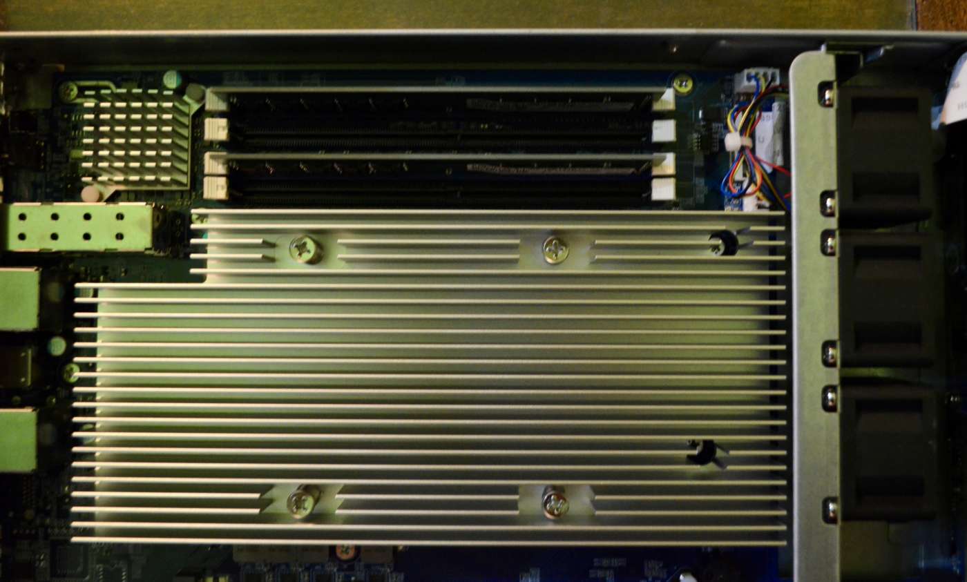 Un grosso dissipatore nasconde il processore Intel Xeon-E e garantisce la circolazione dell’aria, insieme alle tre ventoline che vediamo nel lato destro di questa immagine; la velocità viene gestita automaticamente in base alla temperatura interna. Altre due ventole mantengono fresco l’alimentatore generando un costante flusso d’aria, sempre udibile anche nei momenti di basso carico di lavoro.