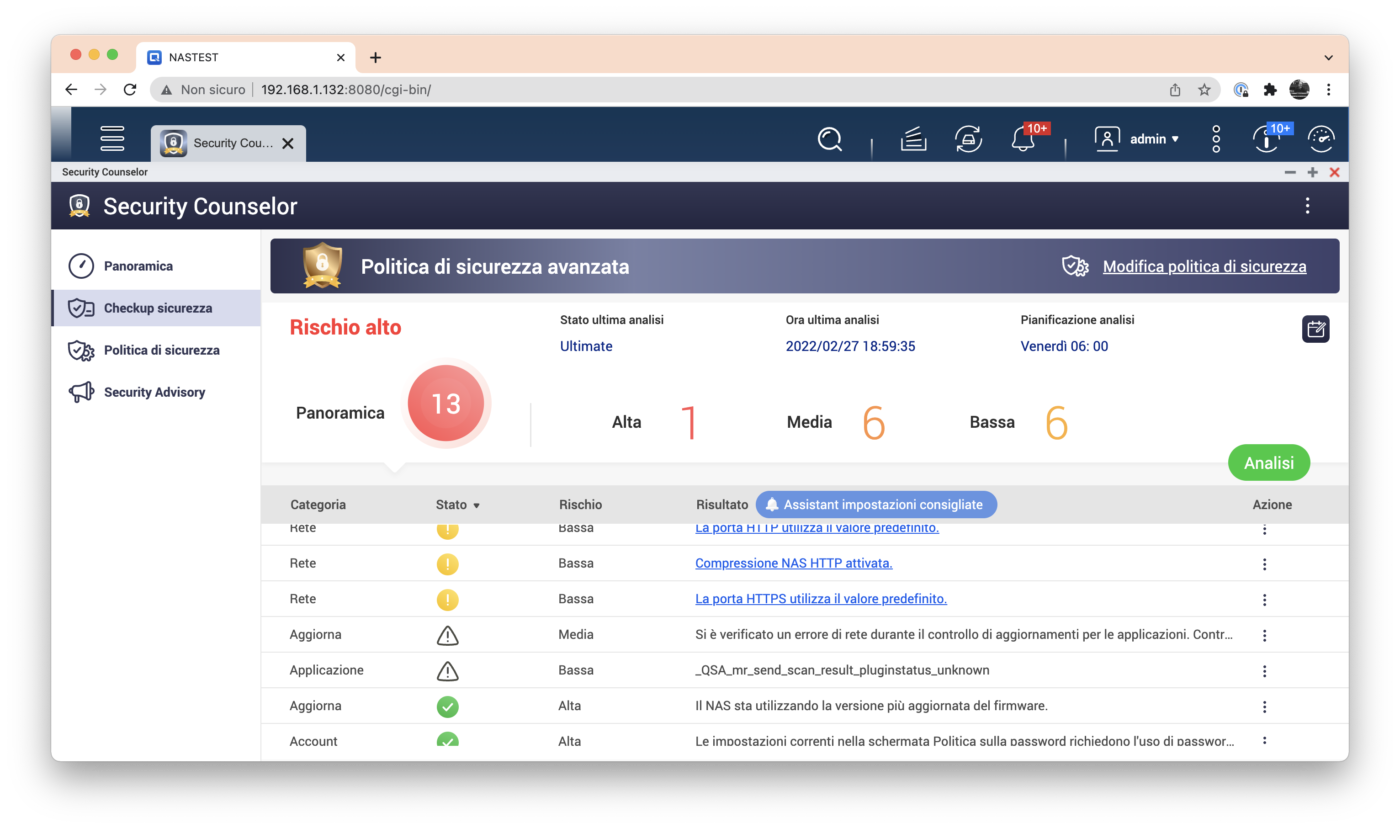 Security Counselor è una delle utility più importanti fra la suite di servizi offerti in QTS: effettua un’analisi periodica per valutare le impostazioni del server e consiglia l’amministratore in azioni atte a prevenire accessi indesiderati e perdita di dati. Una volta configurata la policy di sicurezza, scegliendo una delle tre predefinite o costruendosela sulla base delle proprie necessità aziendali, il sistema continua ad effettuare verifiche e a notificare i problemi all’amministratore; insieme ad antivirus, antimalware e firewall, completa il set minimo di protezioni che ogni servizio su internet dovrebbe sempre considerare.