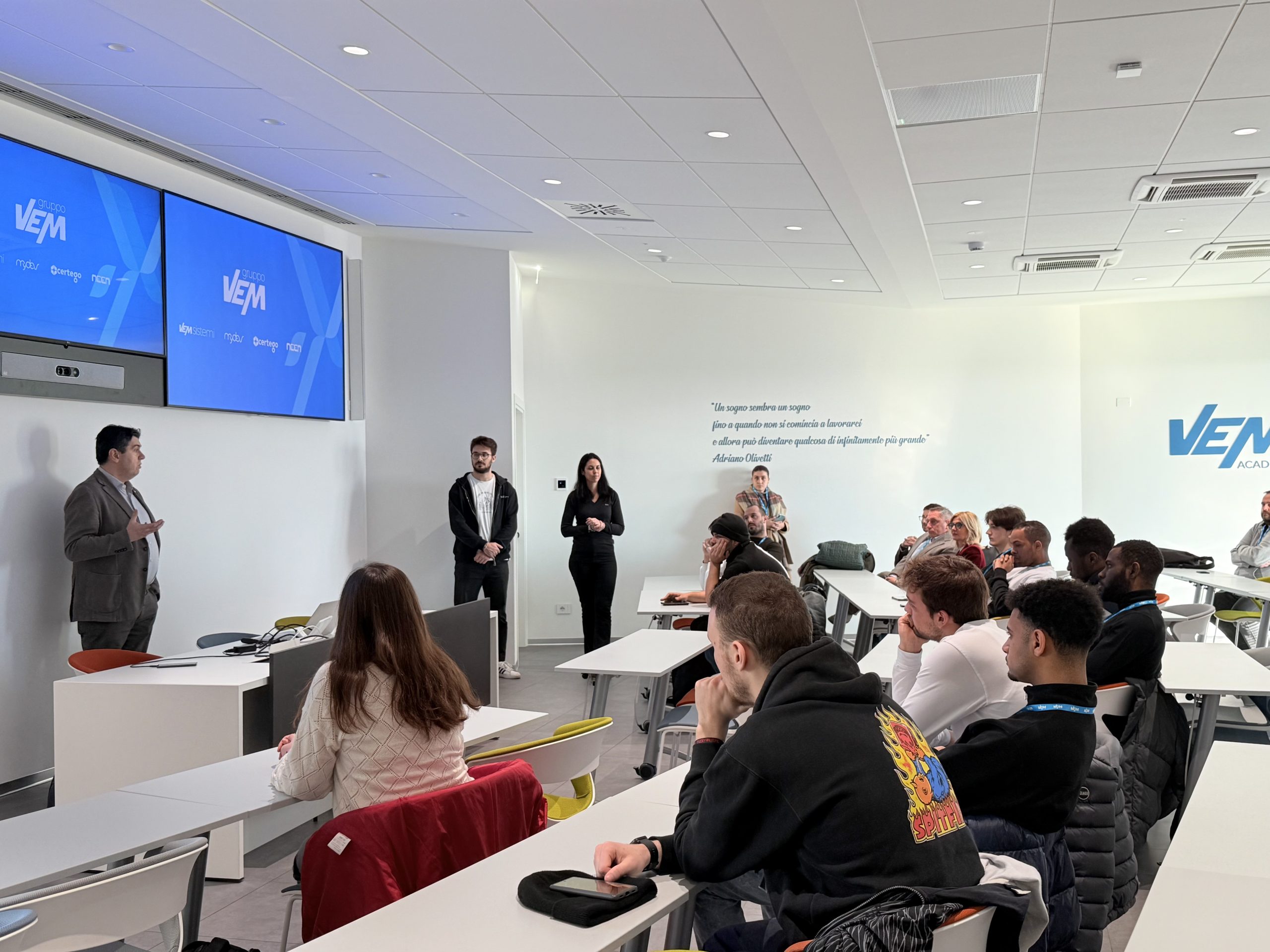 Durante l’inaugurazione, gli studenti sono stati accolti nella sala Academy di VEM per una presentazione aziendale e hanno assistito alla testimonianza di un sistemista esperto. Successivamente, hanno visitato l’Experience Center di VEM sistemi, scoprendo alcune delle soluzioni tecnologiche più innovative attraverso demo dedicate.