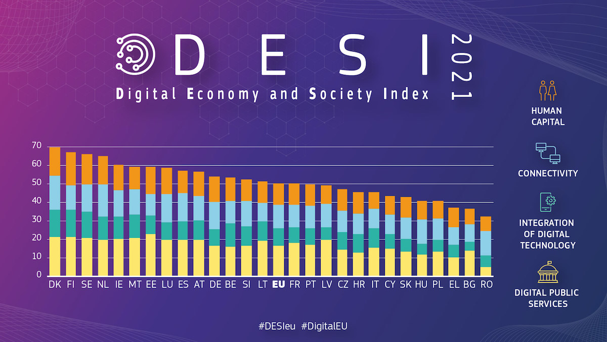 Il Desi 2021 traccia i progressi compiuti negli Stati membri dell’UE nella competitività digitale nei settori del capitale umano, della connettività a banda larga, dell’integrazione delle tecnologie digitali da parte delle imprese e del digitale servizi pubblici.