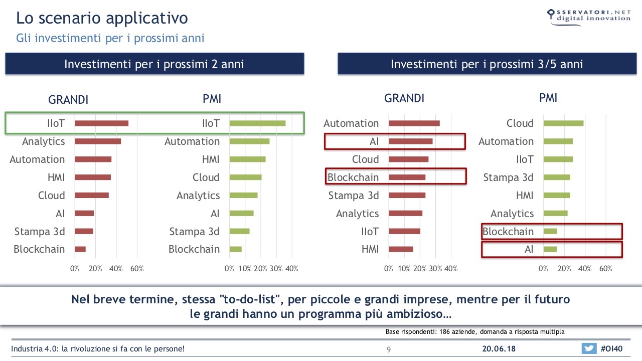 Nei prossimi due anni le aziende hanno intenzione di concentrare gli investimenti in Industrial IoT (48%), Industrial Analytics (39%) e Advanced Automation (33%), mentre se si considera un orizzonte di 3-5 anni le priorità diventano Advanced Automation, Cloud e Additive Manufacturing.