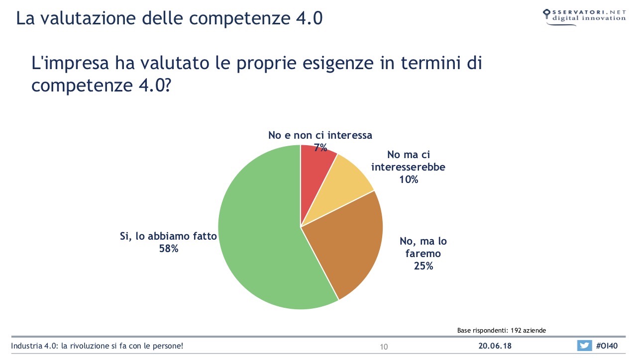 Già il 57% delle imprese si è attivata per identificare le carenze di competenze 4.0 e avviare interventi necessari a colmarle. Circa tre su dieci le giudicano adeguate e altrettante stanno lavorando per migliorarle.