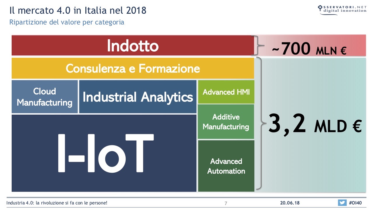 Il mercato dei progetti di Industria 4.0, tra soluzioni It, componenti tecnologiche abilitanti su asset produttivi tradizionali e servizi collegati, raggiunge nel 2018 un valore di 3,2 miliardi di euro, di cui l’82% realizzato verso imprese italiane e il resto export di progetti, prodotti e servizi.