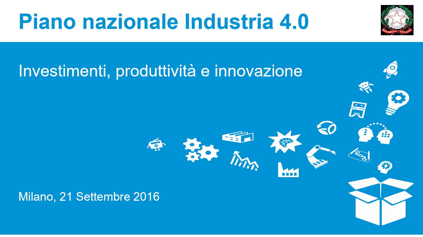 Anche l’Italia ha il suo piano per l’Industry 4.0. Presentato dal ministro per lo Sviluppo economico Carlo Calenda, il piano prevede investimenti innovativi per dieci miliardi di euro per il periodo 2017-2020, che dovrebbero portare all’incremento degli investimenti privati per 80-90 miliardi nel 2017. Altri 11,3 miliardi (nel triennio 2017-20) dovrebbero arrivare dalla spesa privata in ricerca, sviluppo e innovazione con un maggiore focus sulle tecnologie I4.0, mentre sono previsti altri 2,6 miliardi di investimenti privati early stage sempre nello stesso periodo. Per quanto riguarda le competenze saranno coinvolti duecentomila studenti universitari e tremila manager specializzati sui temi della digitalizzazione, insieme alla totalità degli iscritti agli istituti tecnici, con la previsione di varare 1.400 dottorati di ricerca oltre ai competence center nazionali.