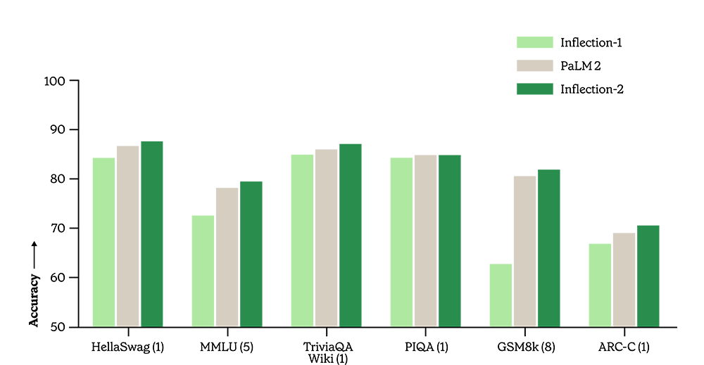 Inflection-2 è stato addestrato su 5.000 GPU NVIDIA H100 in precisione mista fp8 per ~10²⁵ FLOP. Ciò, sottolinea il team, lo colloca nella stessa classe di calcolo di training del modello PaLM 2 Large, fiore all’occhiello di Google, che – secondo Inflection AI – Inflection-2 supera nella maggior parte dei benchmark di prestazioni AI standard, tra cui i ben noti MMLU, TriviaQA, HellaSwag e GSM8k.