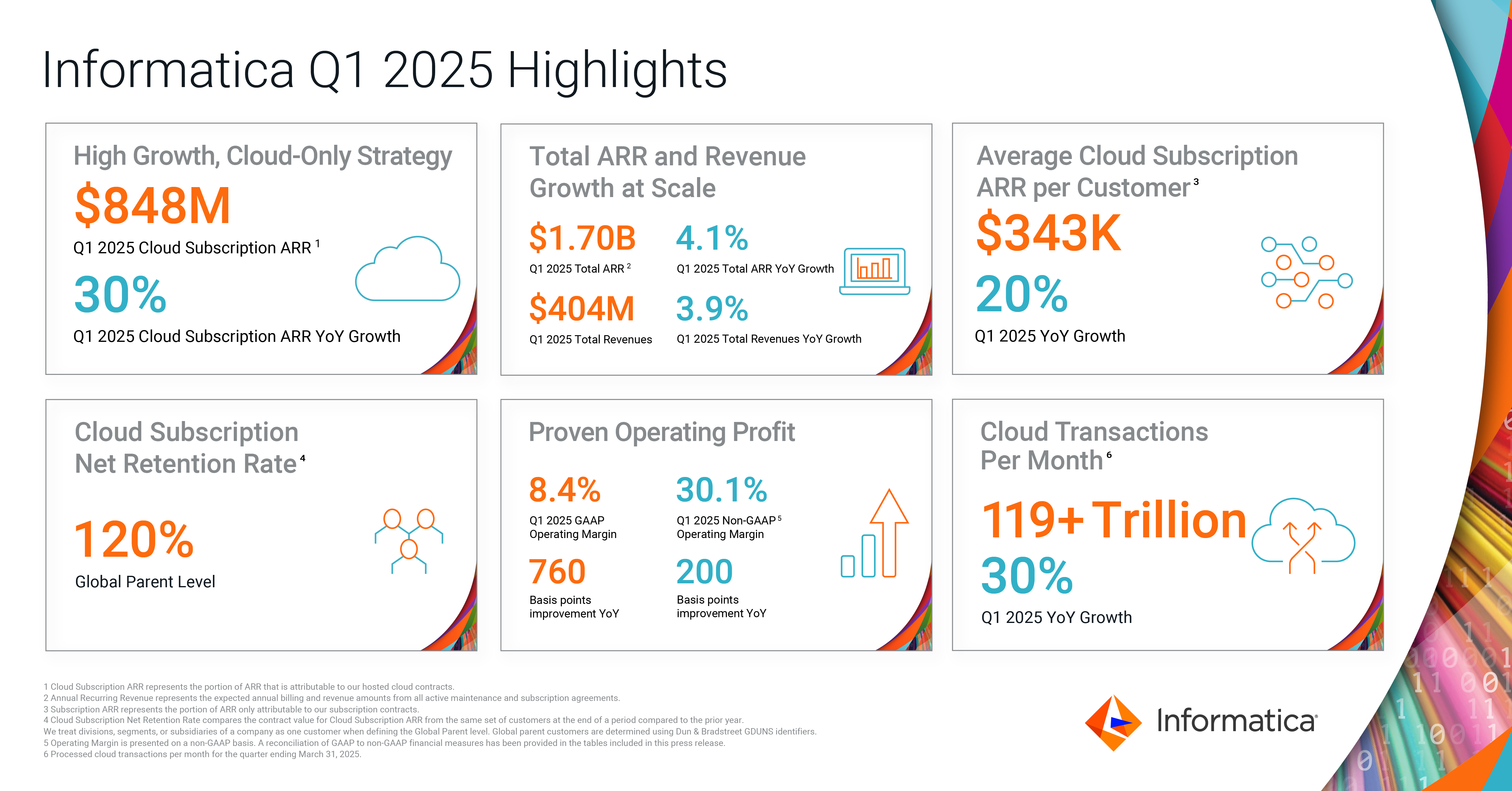 "Informatica’s first quarter results marked a strong start to 2025, reflecting disciplined execution of our strategic initiatives. We exceeded midpoint expectations across all key revenue and profitability metrics with Cloud Subscription ARR growth of 30% year-over-year driven by new cloud workloads, strong cloud net expansion from customers, increased Gen AI usage, and accelerating migrations from our on-premises base to the cloud,” said Amit Walia, Chief Executive Officer at Informatica. “The growth of our cloud platform at scale demonstrates the mission-critical nature of data management. Our product leadership, vast partner ecosystem, and the delivery of data and AI innovation through the IDMC platform reflect our confidence in our ability to perform in the current environment.”