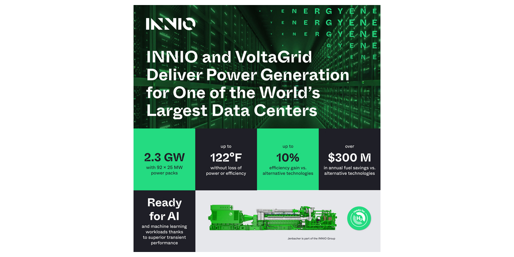 JENBACH, Austria e HOUSTON, USA--(BUSINESS WIRE)--INNIO Group ha annunciato oggi il più grande ordine per erogazione di energia nella sua storia: un progetto innovativo di infrastruttura di produzione di energia da 2,3 GW che ospita 92 alimentatori, ognuno con una produzione di 25 MW. L'iniziativa con VoltaGrid rafforza la posizione di INNIO come fornitore chiave di soluzioni energetiche per il settore in rapida espansione dei data center negli USA.