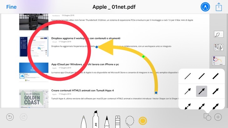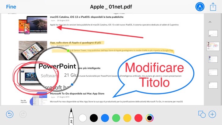 Oppure, ancora, è possibile aggiungere annotazioni a un’immagine o un documento Pdf archiviato nel proprio spazio iCloud Drive, aprendolo dall’app File di iOS e utilizzando gli strumento di Modifica, per poi condividerlo con il proprio team.