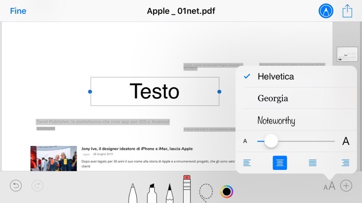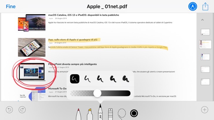Con un tocco sullo strumento selezionato, puoi invece regolare lo spessore, scegliendo quello desiderato tra una serie di opzioni, e l’opacità del tratto, mediante l’apposito slider.