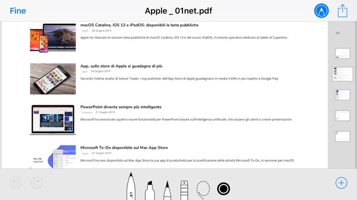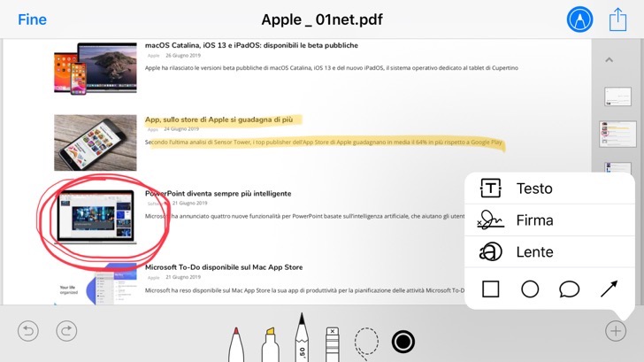 In questo caso possiamo aprire il Pdf allegato alla mail su iPhone, inserire le opportune annotazioni riguardo, ad esempio, eventuali modifiche da apportare al documento, e inviare il Pdf modificato di nuovo per email.