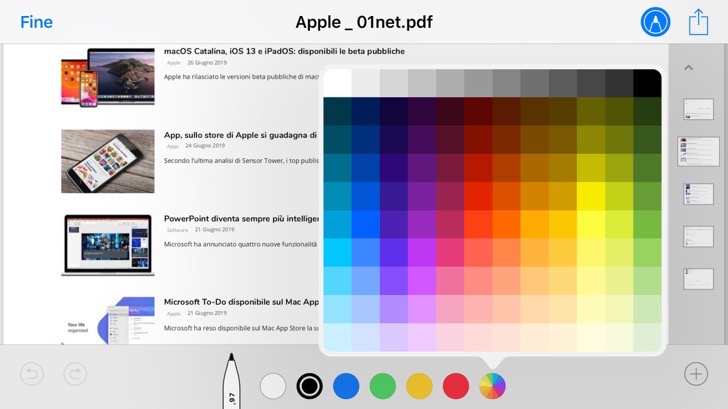 Toccando il colore, è possibile selezionare un nuovo colore per l’inchiostro virtuale dello strumento di disegno selezionato. Oltre a una selezione predefinita con i colori di solito più usati, puoi anche aprire una tavolozza che presenta una scelta cromatica più ampia.