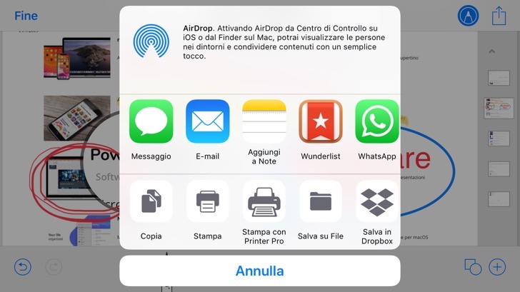 Oppure, per avere a disposizione scelte diverse e più numerose, tocca il pulsante di condivisione di iOS, che mostrerà tutte le opzioni standard presenti sul tuo iPhone per condividere il documento.