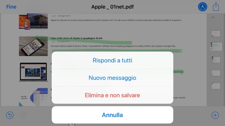 Quando hai finito di inserire le tue annotazioni ed evidenziazioni e sei pronto a inviare il Pdf modificato al mittente, tocca Fine, e Mail ti presenterà tre opzioni: Rispondi a tutti, per rispondere al mittente (o ai mittenti) del messaggio che conteneva l’allegato originale, con il Pdf annotato; Nuovo messaggio, per comporre e inviare un messaggio del tutto nuovo con in allegato il Pdf contenente le annotazioni; oppure Elimina e non salvare, in questo caso il documento Pdf viene chiuso e le modifiche non vengono salvate.