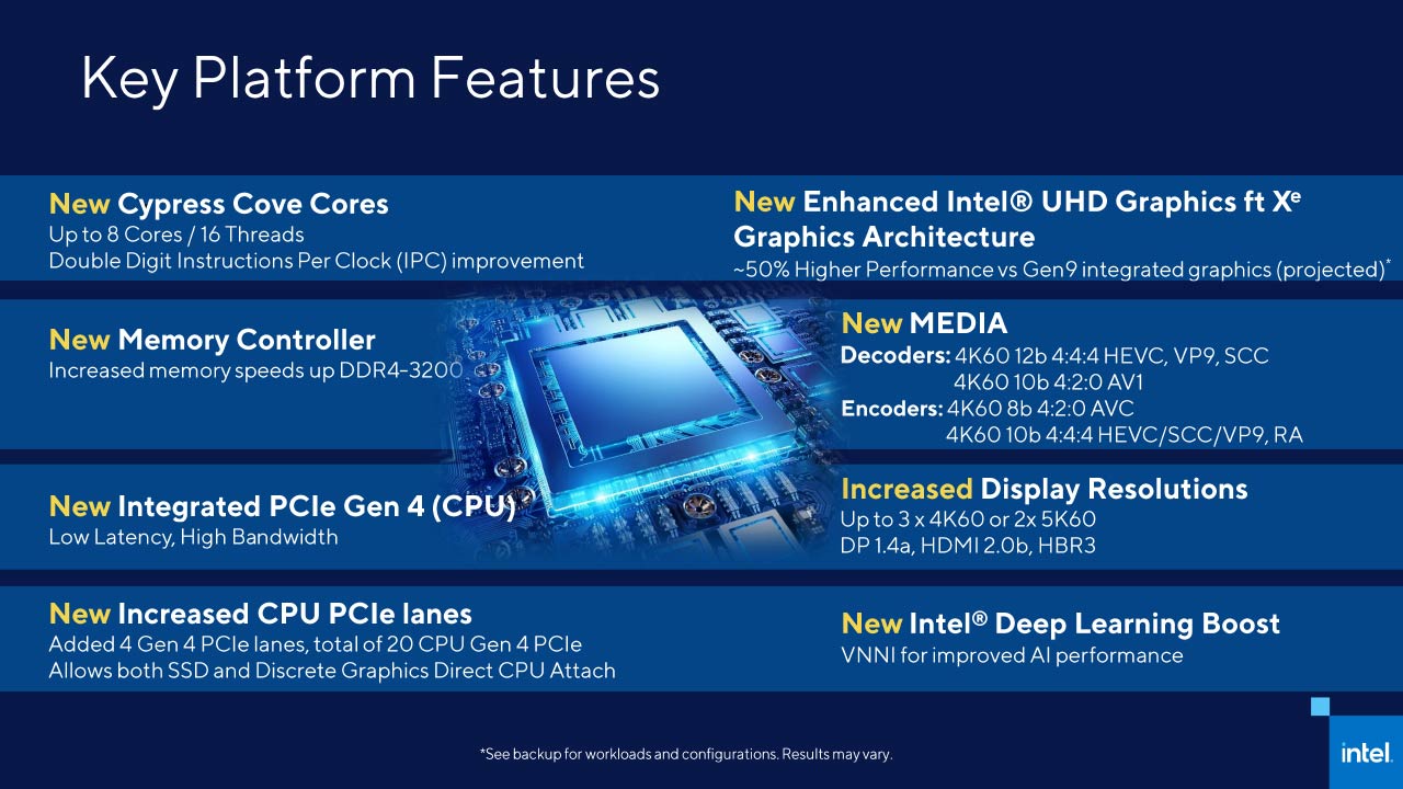 Secondo Intel, la nuova piattaforma abiliterà un miglioramento delle prestazioni IPC (instructions per clock) a due cifre percentuali rispetto alla precedente generazione, oltre a fornire una grafica Intel UHD migliorata con l’architettura Intel Xe Graphics.