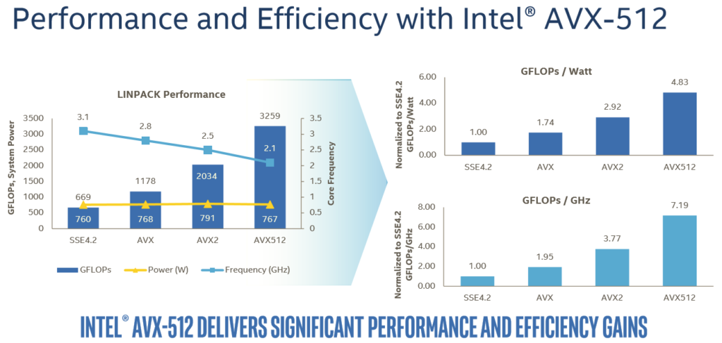 Dal punto di vista delle istruzioni, l’adozione di AVX-512 influisce positivamente non solo sulla capacità di calcolo ma soprattutto sull’efficienza energetica, ossia sulla potenza di calcolo per Watt o per GHz degli Xeon Skylake-SP. Questo permette di consumare meno o di operare a frequenze operative più basse a parità di prestazioni, un elemento importante quando si tratta di datacenter. L’altro lato della medaglia è che questi miglioramenti si hanno solo per il codice che supporta AVX-512, un tema che però interessa più la parte software di Intel e il suo lavoro su librerie e compilatori.